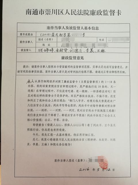 2016年5月16日,我院监察科收到一封案件当事人对顾婷婷、朱尉贤、刘德炎、李晨、王琳表示感谢的廉政监督卡,全文字里行间洋溢着对法官公正裁判的赞许、敬佩和感激,来信人表示:判决体现了公正、平等、法治。